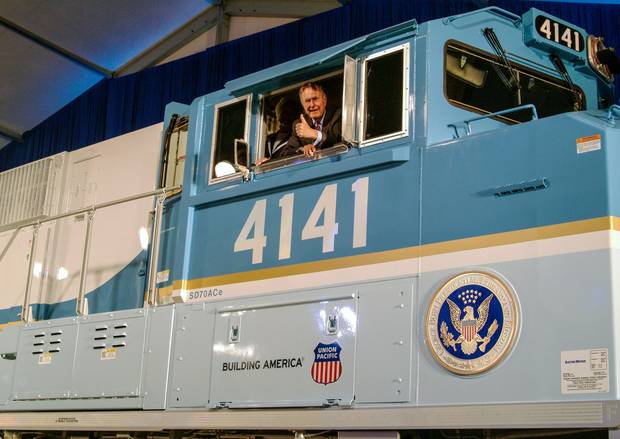 Former US President George H.W. Bush looks out of the cab of Union Pacific locomotive 4141 at its 2005 unveiling in College Station, Texas.
